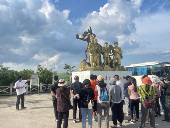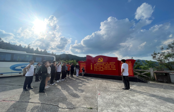 在红军亭,全体党员还瞻仰了红六军团纪念雕塑、烈士纪念碑等红色革命遗址,缅怀革命先烈,并在烈日下重温入党誓词。